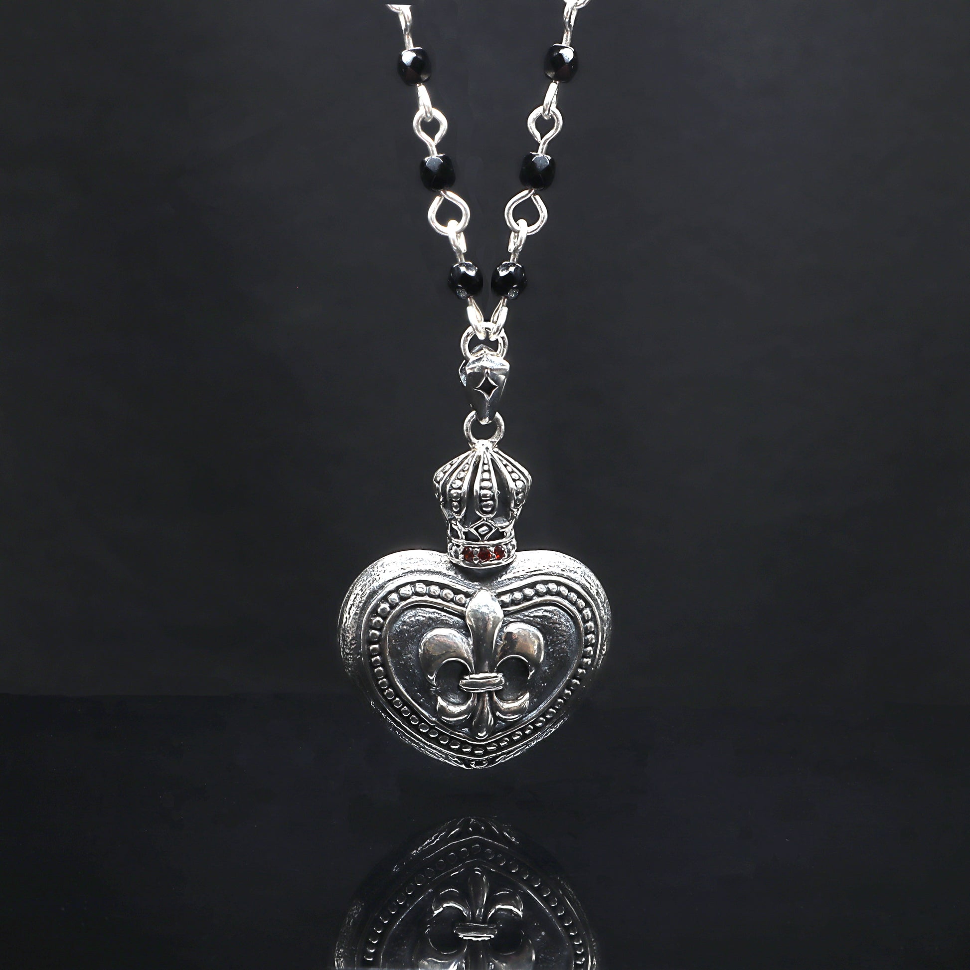 The Fleur-de-lis, in the centre of the heart, was a symbol traditionally used by the French court to represent authority ... but in this pendant represents authority over your own heart.